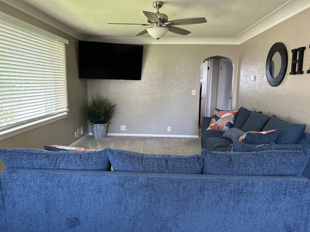 The living room is quite spacious with a sleeper sofa and a smart tv.