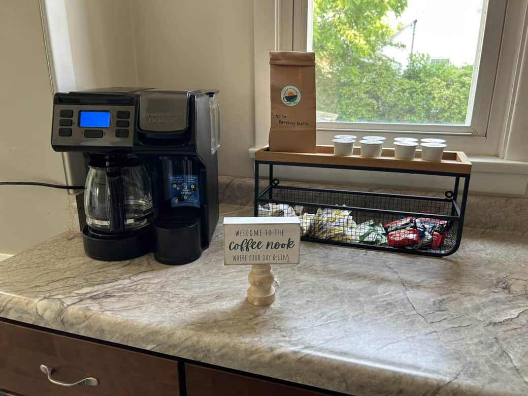 The kitchen is fully stocked with everything you’ll need for a homecooked meal. The dining area has plenty of space for a family meal or for a memorable game night in.